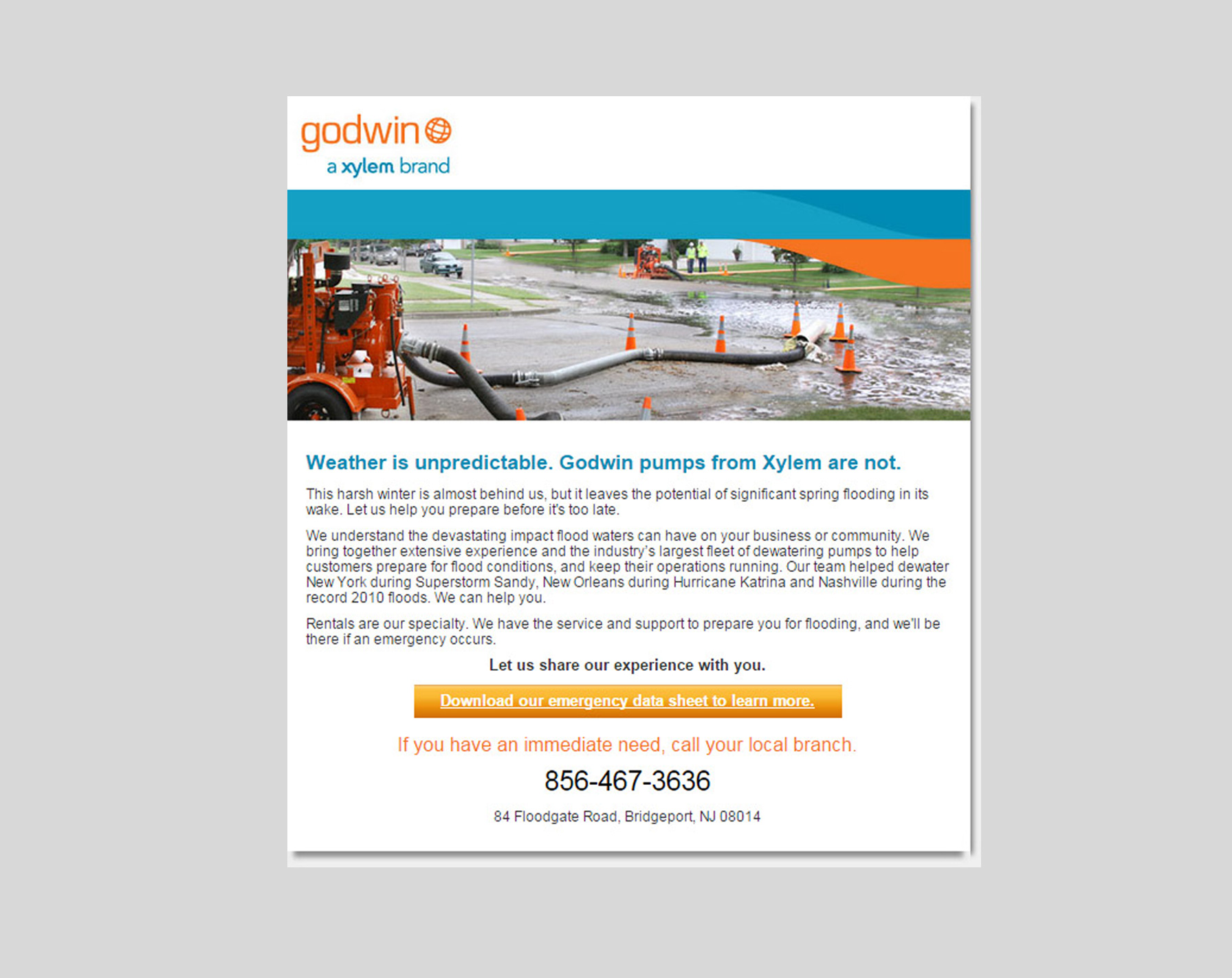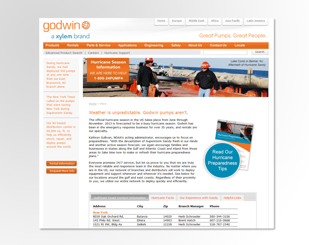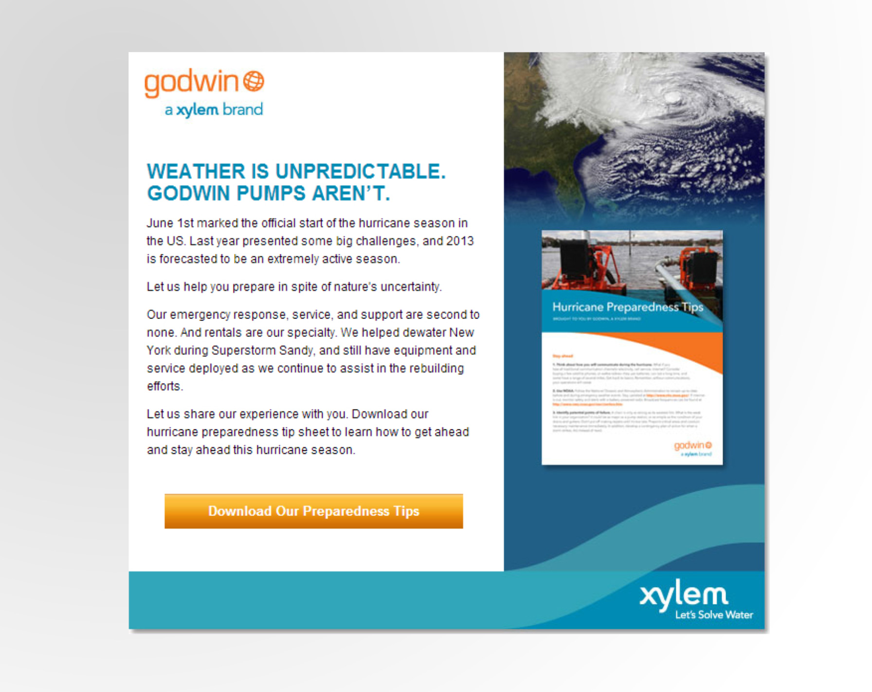 Description: This was a hurricane awareness campaign that touched current and prospective customers to promote brand awareness, Xylem’s 24/7 service and support and easily accessible information readily available to the customer during an emergency.